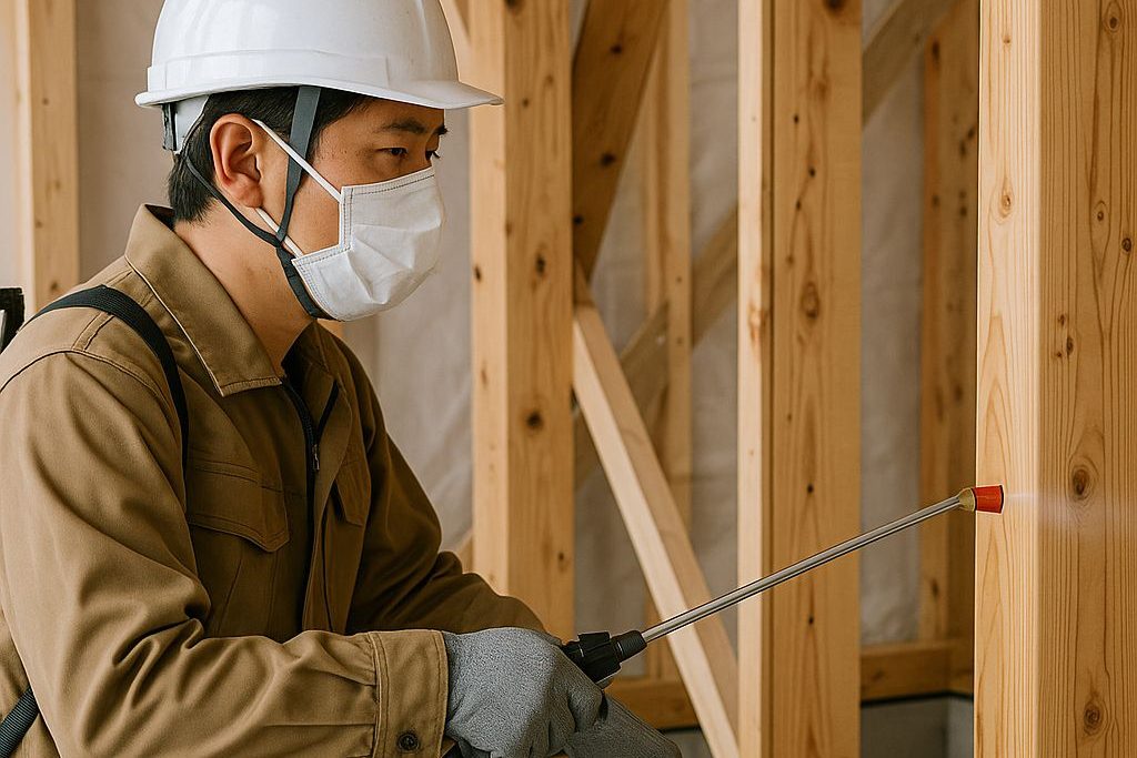 プレカット段階で薬剤処理する場合と、上棟後に現場で処理する場合があります。