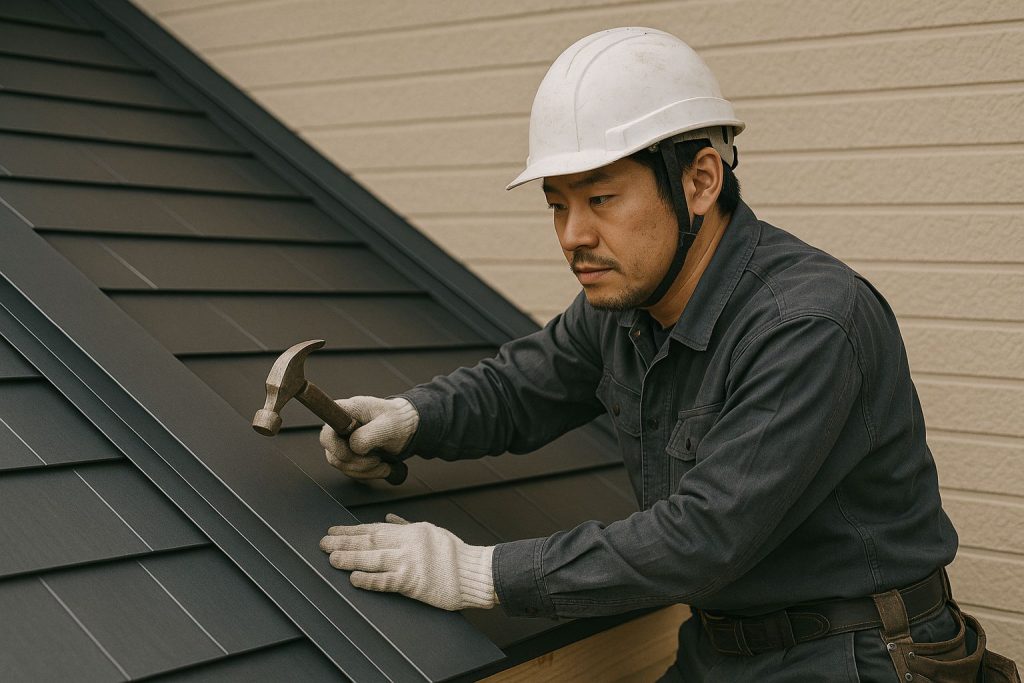 雨漏りを防ぐために金属板施工を行う職人です。