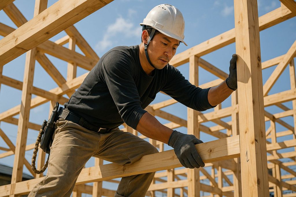梁の上や棟の上に登って木造住宅の骨組みをつくる専門職人です。